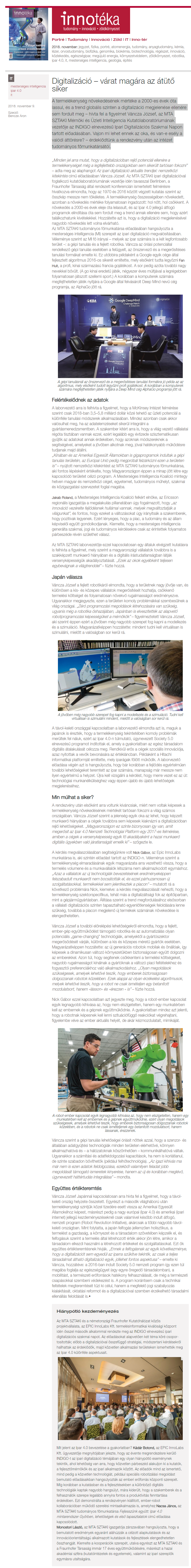A termelékenység növekedésének mértéke a 2000-es évek óta lassul, és a trend globális szinten a digitalizáció megjelenése ellenére sem fordult meg – hívta fel a figyelmet Váncza József, az MTA SZTAKI Mérnöki és Üzleti Intelligencia Kutatólaboratóriumának vezetője az INDIGO el­nevezésű Ipari Digitalizációs Szakmai Napon tartott előadásában. Vajon mi lehet ennek az oka, és van-e esély a valódi áttörésre? – érdeklődtünk a rendezvény után az intézet tudományos főmunkatársától.