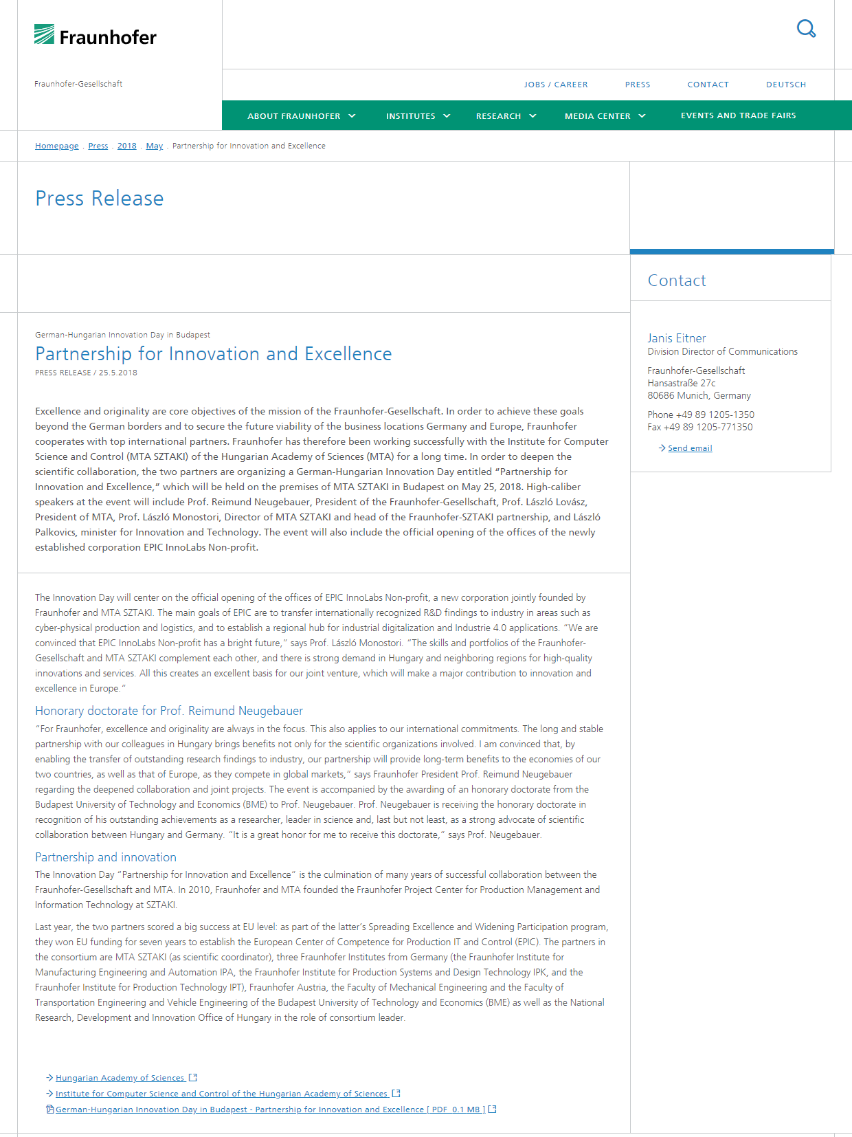 Excellence and originality are core objectives of the mission of the Fraunhofer-Gesellschaft. In order to achieve these goals beyond the German borders and to secure the future viability of the business locations Germany and Europe, Fraunhofer cooperates with top international partners. Fraunhofer has therefore been working successfully with the Institute for Computer Science and Control (MTA SZTAKI) of the Hungarian Academy of Sciences (MTA) for a long time. In order to deepen the scientific collaboration, the two partners are organizing a German-Hungarian Innovation Day entitled “Partnership for Innovation and Excellence,” which will be held on the premises of MTA SZTAKI in Budapest on May 25, 2018.
