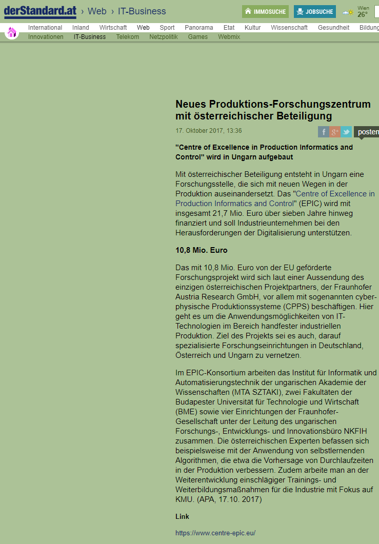 This press release was published on the web page derstandard.at in Austria. After the second consortium meeting held in Vienna the EPIC project was introduced to the Austrians. The article reports on financial data about the project, main topic (cyber physical production systems, CPPS) , the consortium of the project and on the different activities of FhA.