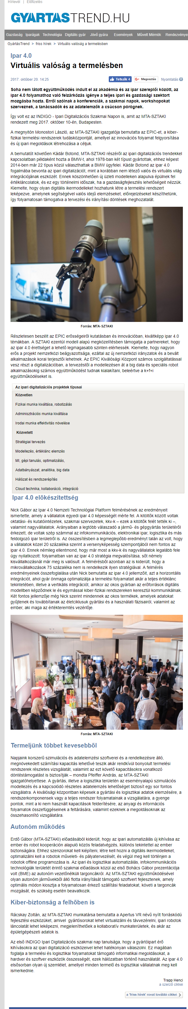 Soha nem látott együttműködés indult el az akadémia és az ipar szereplői között, az ipar 4.0 folyamathoz való felzárkózás igénye a teljes ipari és gazdasági szektort mozgásba hozta. Erről szólnak a konferenciák, a szakmai napok, workshopokat szerveznek, a tanácsadók és az adatelemzők a csúcson pörögnek.
